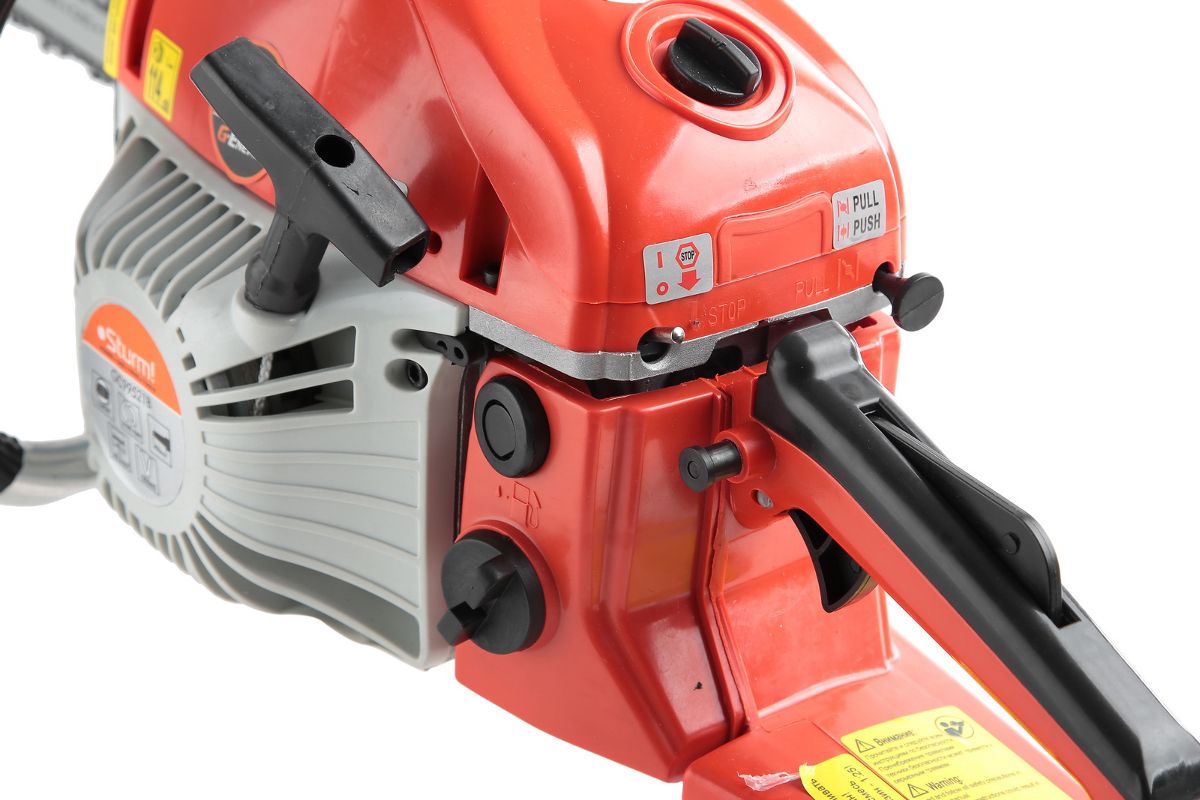 - Цепной тормоз — мгновенно останавливает цепь при отдаче или нажатии на передний упор.